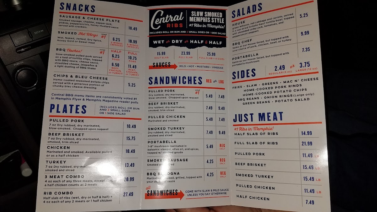 Introducing the menu at Central BBQ Poplar, located at 6201 Poplar Ave, Memphis, TN, is an invitation to savor delightful BBQ offerings alongside fresh, flavorful sides. Renowned for its mouthwatering dishes, the menu features standout items such as the tender brisket potato and the crunchy Portobello salad, each priced at an accessible $12-$15. Families can enjoy a kids' meal for just $7, which includes grilled cheese and chicken tenders.